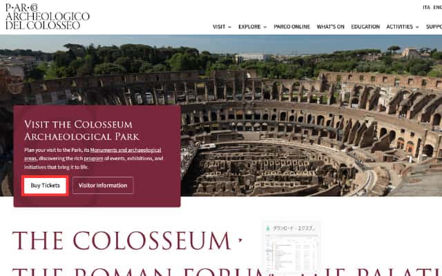 コロッセオ考古学公園のHPより左側の「Buy Tickets」をタップします。