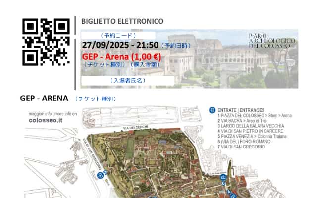 特徴一般的なコロッセオ入場チケットコロッセオへの入場なしコロッセオのアリーナ部分への入場付きコロッセオ上層階への入場付きコロッセオのアリーナ部分への入場・地下ガイドツアー付きコロッセオのアリーナへの入場付きコモドゥス通路のガイドツアー