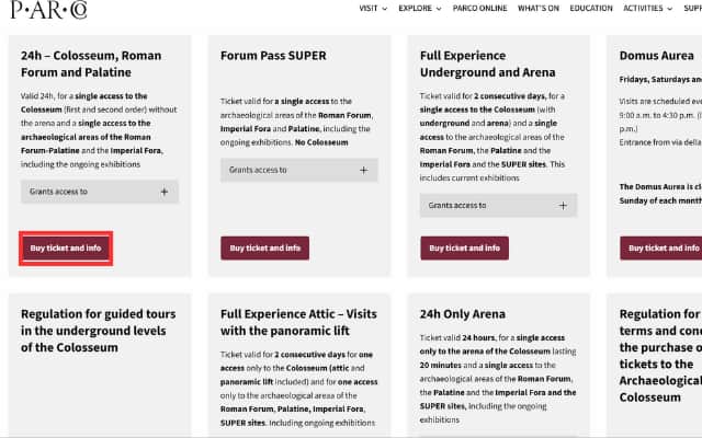 24h – Colosseo, Foro Romano, PalatinoForum Pass SUPERFull Experience ArenaFull Experience Attic – Visits with the panoramic liftFull Experience Underground and Arena24h Only ArenaFull Experience Passaggio di CommodoDomus Aurea
