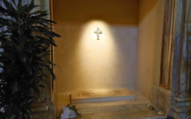 多くの教皇はサンピエトロ大聖堂の地下(グロッタ/Grotta)に眠ることを選択していますが、教皇フランシスコは縁の深いサンタ・マリア・マッジョーレ教会に眠ることを遺言として残しました。今でも多くの人々が弔問に訪れています。白いシンプルな大理石に白い薔薇が一輪添えられているのが印象的でした。