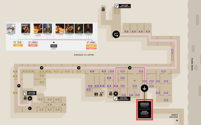 ウフィッツィ美術館の見学自体は3階(piano 2)から始まりますが、ヴァザーリの回廊の集合場所は2階です。